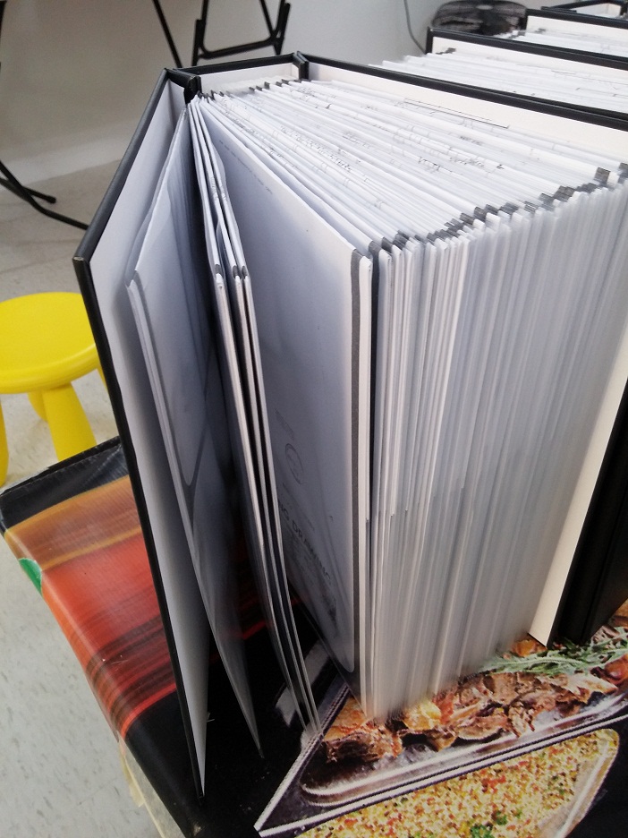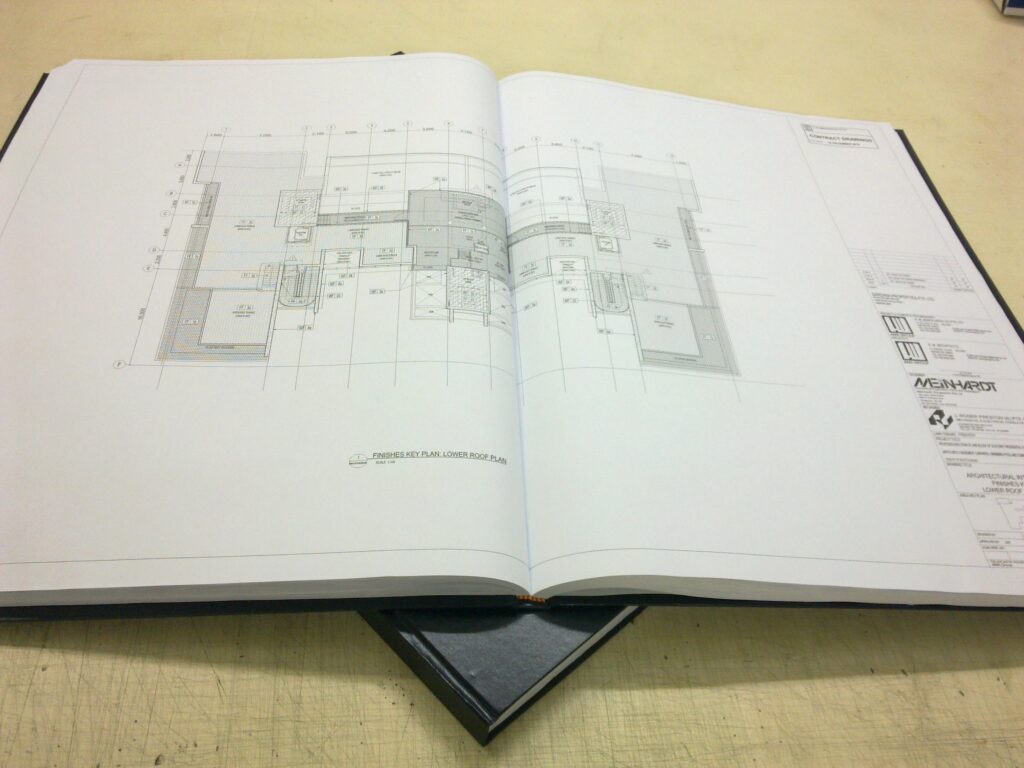 Back to back binding – Most commonly used for large plan prints (as-built drawings). for example an A0 sized drawing that uses back to back binding would be a A1 sized hardcover book that opens up flat enough to read the whole A0 sized drawing.
